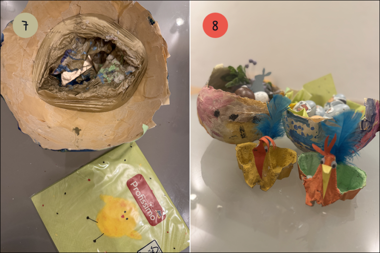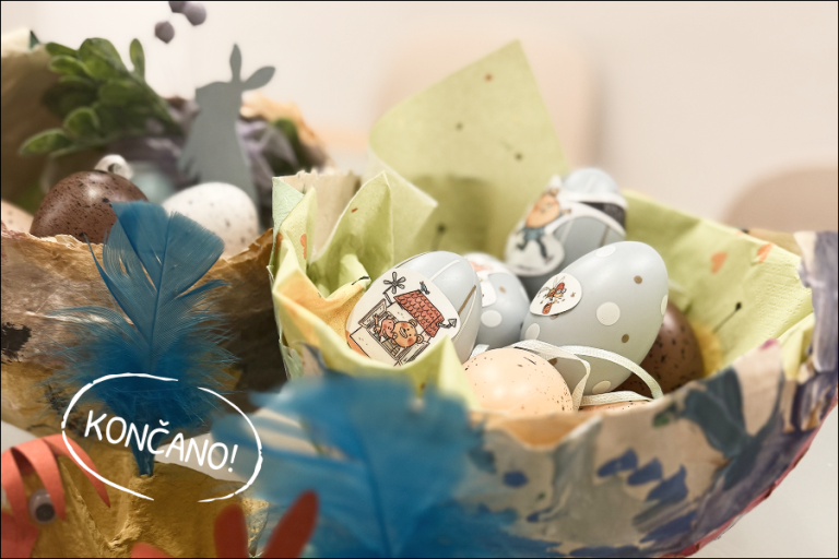 9.) Napolni gnezdo: v gnezdo položi prtičke ali malo slame, nato pa vanj zloži pirhe.